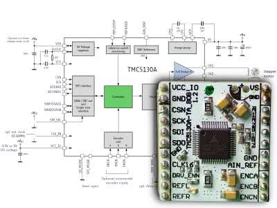 Na fotografiach 1...3 przedstawiono wyroby Trinamica. Oferta, jak widać, jest obszerna, ale wszystkie układy pracują na podobnej zasadzie. Różnice polegają na implementacji w strukturach poszczególnych funkcji i komend, a także interfejsów i protokołów komunikacyjnych. Różna jest też obciążalność, napięcie robocze oraz liczba obsługiwanych silników. Budowę driverów Trinamica przedstawiono na przykładzie układu TMC5130A (rysunek 7).