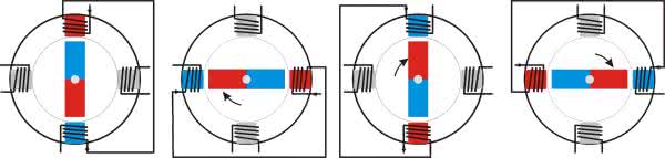 W fazie 2 ponownie więc zasilamy cewkę pierwszą, ale tym razem zostanie odwrócona polaryzacja. Spowoduje to odwrotne namagnesowanie stojana, a w konsekwencji dalszy obrót wirnika o 90° w prawo. Fazę kończy jeszcze jedno analogiczne przełączenie napięć pomiędzy cewkami. Jak można się domyślić, praca tak działającego silnika nie będzie płynna, prawdopodobnie będzie on emitował sporo hałasu i drgań. Nie jest również wykluczone, że przy pewnej częstotliwości przełączania może nawet wpaść w jakiś rezonans mechaniczny. Nie robi również wrażenia rozdzielczość takiej konstrukcji. Wady te są eliminowane przez różne, czasami dość wymyślne modyfikacje budowy silnika, a nawet przez stosowanie dużo bardziej złożonych algorytmów sterowania. Algorytmom te są zwykle nadawane charakterystyczne nazwy, często są one patentowane. Jak przystało na poważnego producenta Trinamic implementuje w swoich sterownikach rozwiązania tego typu. Oto kilka przykładów.