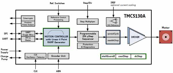 Do najważniejszych bloków funkcjonalnych układu TMC5130A należy zaliczyć te, które decydują o sterowaniu ruchem. Wśród nich wyróżnia się 6-punktowy generator rampy. Jak powiedziano, decyduje on o charakterystyce przyspieszenia i prędkości poruszanego za pośrednictwem silnika krokowego obiektu, i jest konfigurowany za pośrednictwem wewnętrznych rejestrów sterujących drivera. Sygnały z generatora rampy oraz pozostałych bloków realizujących omówione wcześniej funkcje docierają do bloków wykonawczych. Są one jeszcze modulowane przebiegiem sinusoidalnym zapisanym w postaci cyfrowej w 256 elementowej tablicy look-up. Zabieg ten pozwala na realizację mikrokroków. W części wyjściowej zawarto dwie pary półmostków zasilających dwie cewki silnika krokowego. Dwa wewnętrzne przetworniki cyfrowo-analogowe dołączone do komparatorów prądu są wykorzystywane do kształtowania prądu cewek zależnego od wybranej opcji sterowania. Jednymi z nielicznych elementów zewnętrznych są dwa rezystory wykorzystywane do pomiaru natężenia prądu cewek.