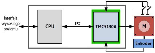 W strukturze układu zawarto wszystkie niezbędne bloki funkcjonalne potrzebne do efektywnego sterowania silnikiem. Przepływ informacji przedstawiono na rysunku 8. Decyzje o ruchach, które należy wykonać są wypracowywane w programie nadzorującym dany proces. Są one przekazywane interfejsem wysokiego poziomu do mikrokontrolera, który za pośrednictwem drivera steruje silnikiem. Chociaż w wielu wypadkach stosowanie enkoderów i przełączników krańcowych nie jest niezbędne, sterowniki Trinamica są przystosowane do ich obsługi. Mogą być one również łączone równolegle (do 256 układów), wymaga to jednak przejścia na interfejs UART łączący mikrokontroler z driverem.