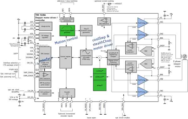 Pełna aplikacja układu TMC5130A wymaga zastosowania kilku zewnętrznych kondensatorów i odpowiedniego połączenia wyprowadzeń decydujących o trybach pracy układu (rysunek 9). W strukturze zawarto pompę napięciową i stabilizator zapewniające odpowiednie zasilanie wszystkich wewnętrznych bloków funkcjonalnych. Kolejną grupę stanowią interfejsy komunikacyjne – SPI, UART, single wire. Driver TMC5130A jako układ synchroniczny musi być taktowany przebiegiem zegarowym. Najczęściej jest to być sygnał generowany wewnętrznie, ale można również korzystać z przebiegu zewnętrznego.