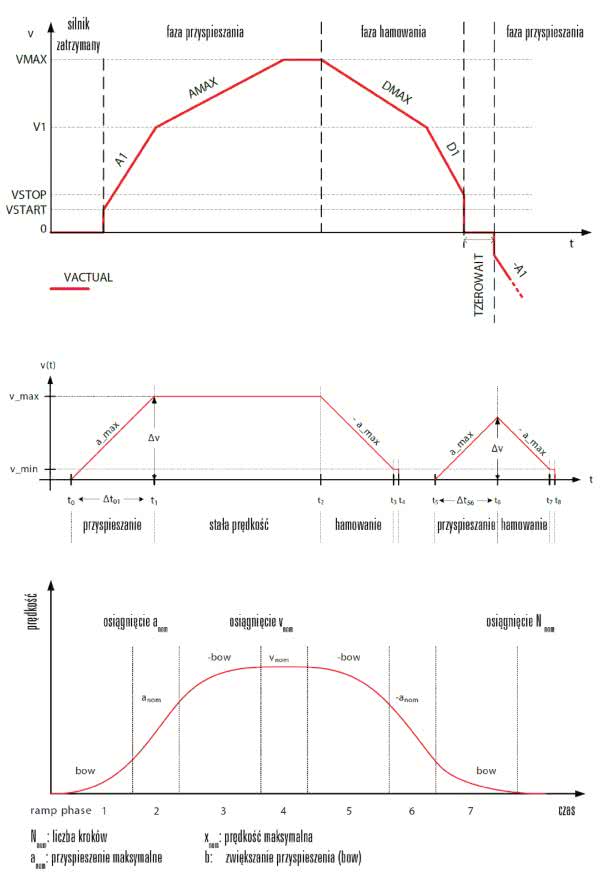 SixPoint. To z kolei złożony algorytm rozpędzania i hamowania silnika (rysunek 6a). Jest on często stosowany przy przemieszczaniu elementów wrażliwych na nadmierne przyspieszenia lub rotacje. Algorytm ten zapewnia łagodny start i zatrzymywanie elementu. Bardzo podobne zastosowanie mają jeszcze algorytmy: 3-punktowy (rysunek 6b) i S-shape (rysunek 6c).