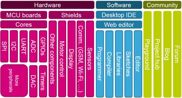 Chcąc lepiej poznać i zrozumieć czym jest Arduino warto przejść od ogólników do szczegółów. Platformę podzielić można na trzy obszary: warstwę sprzętową, warstwę programową oraz społeczność. Odpowiedni schemat blokowy pokazano na rysunku 1. Przyjrzyjmy się bliżej każdemu z tych obszarów.