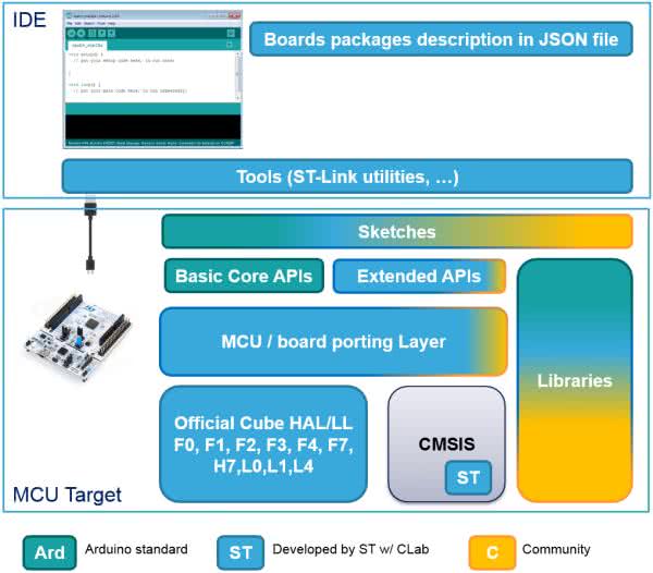 Rok 2017 zmienił oblicze Arduino. Twórcy platformy zawarli porozumienie z firmą ARM, na mocy którego obie instytucje zadeklarowały chęć współpracy. Jak wiadomo firma ARM nie produkuje układów półprzewodnikowych, jednakże projektuje rdzenie mikrokontrolerowe oraz gromadzi wokół siebie wielu partnerów, w tym firmy produkujące mikrokontrolery wykorzystujące architekturę ARM. Dzięki zawartemu z ARMem porozumieniu Arduino zachowało pełną niezależność i jednocześnie otworzyło sobie drzwi do współpracy znacznie szerszej niż historyczne partnerstwo z firmą Atmel. I tak właśnie dzięki wspólnym wysiłkom i zaangażowaniu twórców Arduino, społeczności Arduino oraz firmy STMicroelectronics możliwe stało się pracowanie z mikrokontrolerami STM32 korzystając z platformy Arduino. Schemat blokowy pokazujący w jaki sposób mikrokontrolery STM32 wraz z ekosystemem zostały zespolone z platformą Arduino pokazano na rysunku 4.