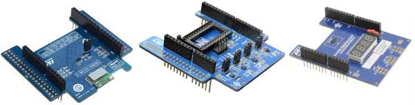 Oprócz płytek uruchomieniowych zgodnych z Arduino, a więc STM32 Nucleo i STM32 Discovery, firma STMicroelectronics oferuje szeroką gamę płytek rozszerzeniowych kompatybilnych ze standardem stworzonym przez Włochów. Takich płytek jest na dzień dzisiejszy łącznie 51. Dają one możliwość rozbudowania płytki uruchomieniowej o podzespoły takie jak czujniki środowiskowe/odległości/MEMS, sterowniki silnika DC/BLDC/krokowego/3-fazowego, obwód audio, komunikację Bluetooth/sub-1 GHz (w tym LoRa)/Wi-Fi/USB typ C/NFC/PLC, wzmacniacze operacyjne, czy też kontroler LED. Kilka przykładowych płytek rozszerzeniowych pokazano na rysunku 6.