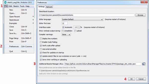 Przejdźmy teraz do warstwy programowej. Obsługa układów STM32 nie jest aktywna domyślnie w Arduino IDE. W związku z tym osoba chcąca używać mikrokontrolerów firmy STMicroelectronics musi odpowiednio skonfigurować środowisko programistyczne. Czynność ta sprowadza się do zainstalowania pakietu o nazwie STM32duino. Jako że nie jest to oficjalny pakiet Arduino i nie znajduje się on pod adresem internetowym, do którego Arduino IDE się odnosi, użytkownik musi w pierwszym kroku wskazać środowisku adres właściwy dla STM32duino. W tym celu należy z menu głównego wybrać pozycję File, a następnie Preferences. W wyniku tego otworzone zostanie okno Preferences. W pierwszej zakładce o nazwie Settings zlokalizować należy pole Additional Boards Manager URL, a następnie trzeba je wypełnić następującym adresem: http://bit.ly/2OkMbNL. Zatwierdzenie zmian odbywa się naciśnięciem przycisku OK. Opisane czynności zobrazowano na rysunku 7.