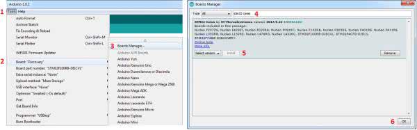 Ten krok kończy etap konfiguracji Arduino IDE. Środowisko programistyczne jest gotowe do pracy z mikrokontrolerami STM32. W tym momencie użytkownik może wskazać płytkę uruchomieniową, którą zamierza używać. Wyboru dokonuje się z poziomu menu głównego. Pozycja Tools, a następnie Board pozwala na wybranie rodzaju płytki tzn. Discovery, Nucleo-32, Nucleo-64 lub Nucleo-144. Z kolei pozycja Tools, a następnie Board Part Numbers umożliwia wybranie konkretnego modelu płytki z wybranej wcześniej grupy. Poniżej zamieszczono listę płytek wspieranych na dzień dzisiejszy przez zainstalowany pakiet:
