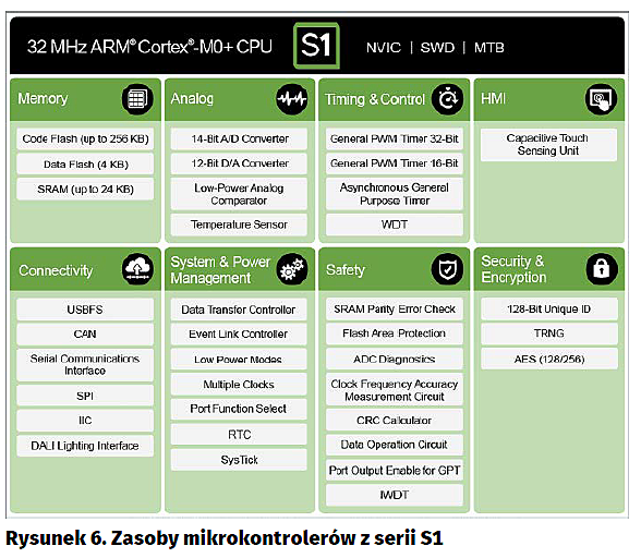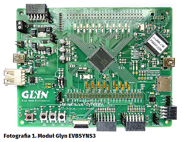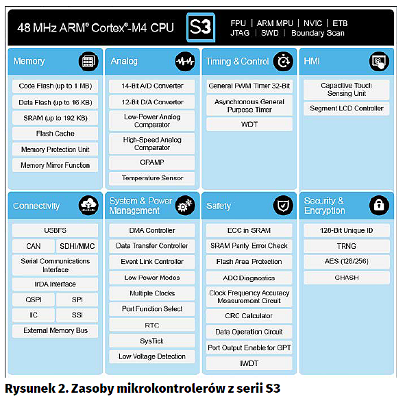 Głównym elementem pokazanego na fotografii 1 zestawu ewaluacyjnego EVBSYNS3 jest mikrokontroler z serii S3 R7SF3A77C3A01CFP. To jednostka z rdzeniem ARM Cortex M-4 taktowana z maksymalną częstotliwością 48 MHz. Na rysunku 2 pokazano zestawienie zasobów: pamięci programu i pamięci stałych danych Flash, pamięci danych SRAM i układów peryferyjnych. Lista układów peryferyjnych jest imponująca. Wystarczy wymienić te najważniejsze: