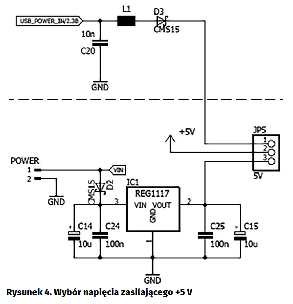 Wszystkie linie mikrokontrolera wyprowadzono na podwójne listwy goldpinów o rozstawie 2,54 mm. Oprócz tego na płytce zostały umieszczone pola lutownicze do wlutowania złącz z wyprowadzeniem sygnałów i zasileń zgodnych ze standardem Arduino. Źródłem zasilania może być złącze USB device, złącze USB Jlink lub zewnętrzne napięcie o wartości +6….9 V (wartość maksymalna) doprowadzone do złącza śrubowego POWER. Napięcie ze złącza POWER jest stabilizowane przez stabilizator LM1117-5.0. Następnie, napięcie +5 V z wyjścia stabilizatora lub alternatywnie +5 V ze złącza USB jest podawane na stabilizator +3,3 V, to jest układ LM3940 zasilający mikrokontroler. Wybór rodzaju źródła zasilania +5 V odbywa się za pomocą zwierania styków zworki JP5. Pokazano to na rysunku 4.