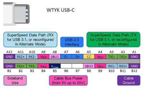 - RX1-, RX1+ oraz TX1-, TX1+, będące magistralą danych SuperSpeed standardu USB 3.1.