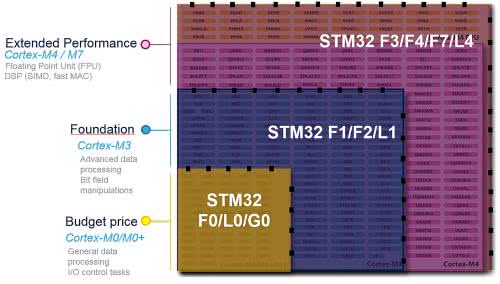 Jedną z ważnych cech mikrokontrolerów STM32 jest kompatybilność programowa i skalowalność architektury w ramach różnych rodzin, z różnymi rdzeniami. Innymi słowy, projektant lub programista stosujący mikrokontrolery STM32 może używać tanich procesorów o nieskomplikowanej architekturze, na przykład z rdzeniem Cortex-M0+, lub zależnie od potrzeb, bardziej wydajnych z rdzeniem Cortex-M3 lub najbardziej rozbudowanych i wydajnych Cortex-M4 i Cortex-M7. Zmiana rodziny mikrokontrolerów nie wymaga przy tym zmiany przyzwyczajeń, poznawania nowych narzędzi projektowych (IDE, konfiguratora peryferii) itp. Również przenoszenie istniejących aplikacji jest bardzo uproszczone, jeżeli jest możliwe w ramach mikrokontrolerów. Na rysunku 1 pokazano przypisanie rdzeni Cortex do rodzin mikrokontrolerów produkowanych przez ST.
