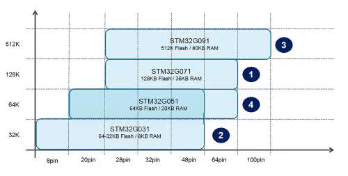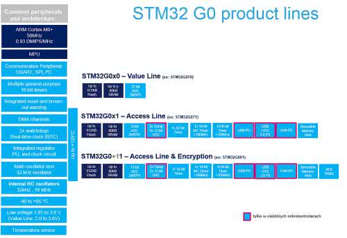Rodzina mikrokontrolerów STM32G0 jest ulepszonym następcą znanej i popularnej rodziny STM32F0. Podzielono ją w zależności od wyposażenia w układy peryferyjne na trzy linie: Value Line, Access Line, Access Line & Encryption. Wyposażenie w zasoby (pamięć, peryferia itp.) w zależności od linii zostało pokazano na rysunku 2. Spójrzmy, jakich modyfikacji użytkowych możemy się spodziewać.