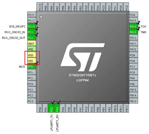 Obudowy mikrokontrolerów 32-bitowych często mają kilka par wyprowadzeń linii zasilających. Komplikuje to projekt płytki i ogranicza liczbę linii portów dostępnych w obudowie danego typu. W rodzinie STM32G0 w obudowach mających do 64 wyprowadzeń zasilanie jest doprowadzane tylko przez dwa wyprowadzenia zasilania. W obudowie 64-nóżkowej mamy do dyspozycji 60 linii I/O. Na rysunku 4 pokazano obudowę LQFP64 mikrokontrolera STM32G071 z zaznaczonymi wyprowadzeniami zasilania.