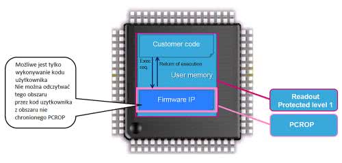 - PCROP (Propiertary Code Protection), używany do ochrony zapisu i odczytu specyficznych obszarów pamięci programu. Chroniony kod może być tylko wykonywany (rysunek 6).