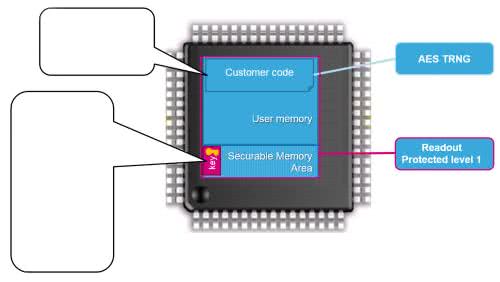 Użytkownik może programowo aktywować specjalny obszar pamięci o definiowanej wielkości, nazywany Securable Memory Area. Kiedy ten obszar jest aktywny, wtedy to każda próba dostępu do niej: pobranie kodu, odczyt, programowanie czy kasowanie, jest odrzucana i powoduje błąd magistrali. Tak definiowana pamięć może przechowywać, na przykład, klucze do kodów deszyfrujących (rysunek 7). Dezaktywacja jest możliwa za pomocą firmware'u użytkownika.