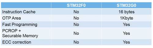 Jedną z istotnych modyfikacji rdzenia Cortex-M0+ w porównaniu do Cortex-M0 jest dodanie 16-bajtowej pamięci cache, do której są zapisywane pobierane kody rozkazów. Takie rozwiązanie, znane z wielu rozbudowanych i wydajnych jednostek, może wyraźnie zwiększyć szybkość pracy mikrokontrolera. W trakcie wykonywania kodu rozkazy są pobierane z szybkiej cache do momentu napotkania rozkazu skoku. Podstawowe różnice pomiędzy rodzinami STM32F0 i STM32G0 pokazano na rysunku 9.
