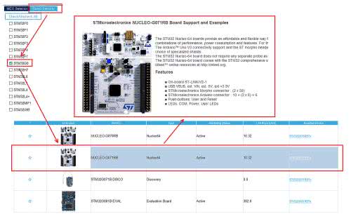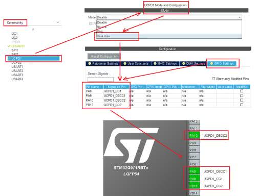 Producent mikrokontrolerów STM32G0 przygotował wsparcie dla projektantów w postaci modułów Nucleo (zgodnych z Arduino), zaawansowanego modułu ewaluacyjnego z mikrokontrolerem STM32G081 i niewielkiego modułu Discovery. W konfiguratorze STM32Cube można je wybrać w selektorze modułów (Board selector) i stworzyć szkielet programu z konfiguracjami układów peryferyjnych i ewentualnie firmware. Na rysunku 11 pokazano wybór modułu NucleoG071RB za pomocą selektora Board Selector i rodziny STM32G0. Na rysunku 12 przedstawiono przykładową konfigurację wyprowadzeń portu USB PDI w trybie Dual Role (jako źródło i jako odbiornik zasilania) w STM32CubeMX, natomiast na rysunku 13 przykładową konfigurację portu USB PDI w STM32CubeMX.