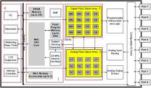 PSoC przypomina układ FPGA: po włączeniu zasilania system musi zostać skonfigurowany, ale konfiguracja ta odbywa się poprzez ładowanie instrukcji z wbudowanej pamięci Flash. W układzie tym znaleźć można także bloki logiki programowalnej - UDB.