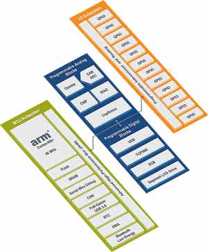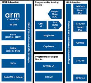 Układy PSoC składają się generalnie z rdzenia, konfigurowalnych bloków analogowych i cyfrowych oraz zestawu programowalnych połączeń wewnętrznych pomiędzy tymi blokami i pinami zewnętrznymi. Konfigurowalne bloki, zwłaszcza analogowe i PLD, w PSoC są największą różnicą w porównaniu z innymi mikrokontrolerami dostępnymi na rynku.