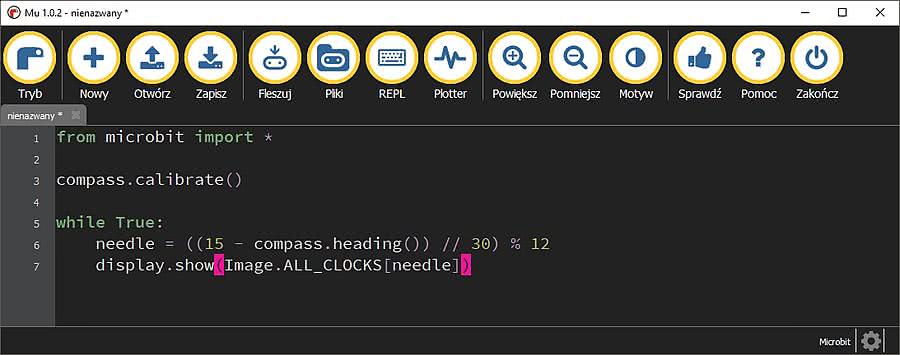Drugim narzędziem polecanym do programowania płytek micro:bit jest MicroPython. Edytor dostępny jest w wersji przeglądarkowej oraz jako aplikacja do zainstalowania. Główne okno programu pokazuje rysunek 4. Python jest językiem programowania, który w ostatnim czasie zyskał na popularności, zwłaszcza wśród użytkowników komputerków typu Rasberry. Dlatego edytor MicroPython będzie dobrym wyborem dla każdego elektronika, z tym językiem na pewno jeszcze będzie miał do czynienia. Warto wiedzieć, że jest to język interpretowany czyli taki, który jest tłumaczony i wykonywany „w locie”. Maszyna, na której uruchamiany jest program musi mieć uruchomiony tzw. interpreter. Wszystkie informacje na temat programowania płytek micro:bit w języku Python można znaleźć tu: http://bit.ly/2ZvTV5a. Ważną infomacją jest to, że MicroPyhon nie obsługuje BLE. Jest to spowodowane zbyt małą ilością pamięci RAM płytek micro:bit. Komunikacja radiowa realizowana jest innymi, prostszymi metodami.
