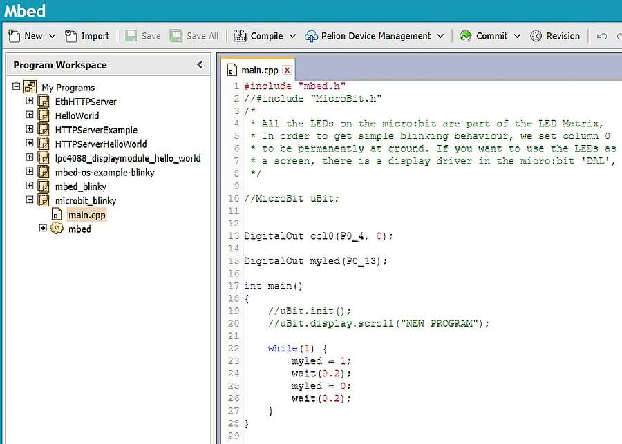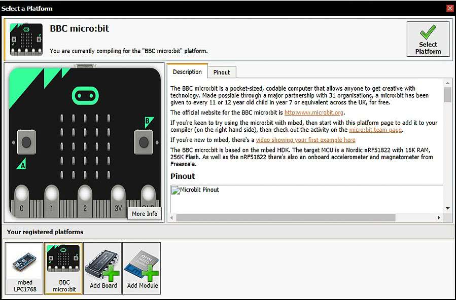 Dla tych, którzy ciągle czują niedosyt i uważają, że prawdziwe programowanie mikrokontrolerów wymaga użycia języka C, też jest propozycja. Platforma ARM MBED (http://bit.ly/2zmUTSF) posiada wsparcie dla płytek micro:bit. Po utworzeniu konta i zalogowaniu się na platformie, uruchamiamy edytor/kompilator przeglądarkowy i tam w prawym górnym rogu klikamy ikonę symbolizującą naszą aktywną platformę sprzętową. W oknie, które się pojawi klikamy na Add Board i postępujemy zgodnie z instrukcjami wyszukując, spośród wielu dostępnych typów, płytkę micro:bit (rysunek 5).