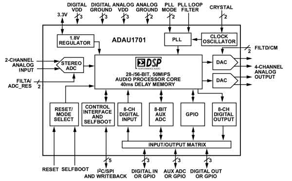 Schemat wewnętrzny układu ADAU1701 pokazano na rysunku 3. Jego najistotniejsze cechy to: