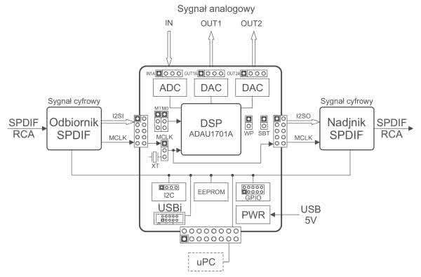 Aby w pełni wykorzystać zestaw AudioDSP konieczne jest zapoznanie się z budową blokową jego serca, czyli procesora DSP. Układ ADAU1701A jest nie tylko procesorem DSP, ale całym zintegrowanym systemem cyfrowej obróbki sygnału audio, wyposażony w przetworniki AD/DA, uniwersalne porty GPIO oraz cyfrowe interfejsy audio. Współpracuje z zewnętrzną pamięcią programu EEPROM I2C, dzięki czemu możliwa jest budowa systemu obróbki sygnału audio, bez zewnętrznego procesora sterującego i przy zastosowaniu niewielkiej liczby elementów.