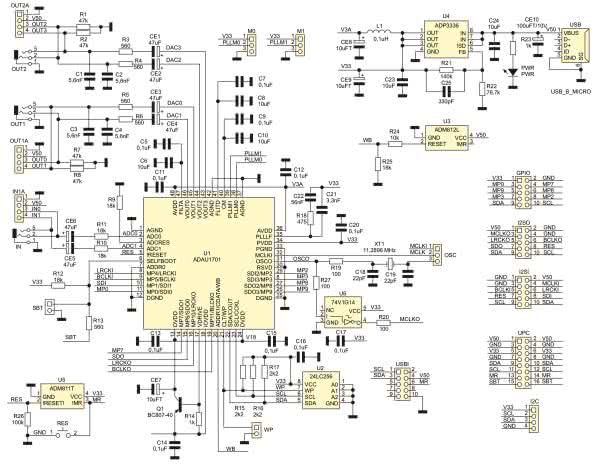 Wszystkie porty ADAU1701A wyprowadzono na złącza szpilkowe (R=2,54 mm) i pogrupowano funkcjonalnie na port sterujący GPIO, wejście I2SI oraz wyjście I2SO sygnału cyfrowego interfejsu audio.
