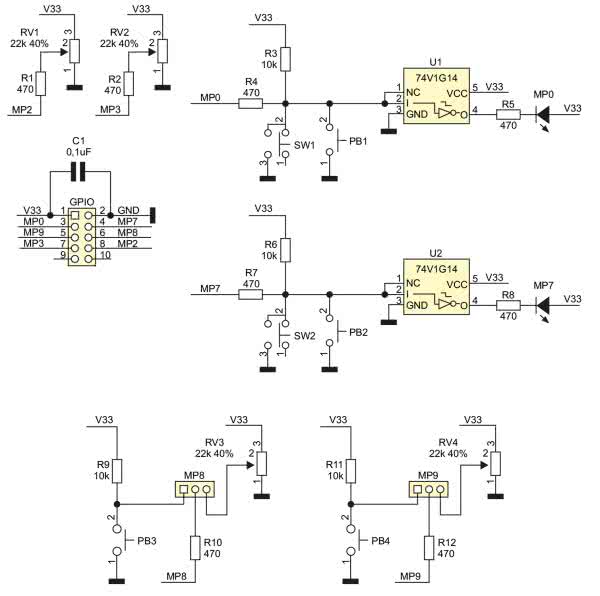 Schemat płytki pokazano na rysunku 8. Potencjometry RV1, RV2 podłączone są na stałe do wyprowadzeń GPIO2 i 3. Potencjometry RV3, RV4 współdzielą porty MP8 i 9 z przyciskami chwilowymi PB3 i 4, wybór aktywnej funkcji możliwy jest zworami MP8 i 9. Porty MP0 i 1 połączone są z przyciskami chwilowymi PB1 i PB2 z równolegle połączonymi przełącznikami suwakowymi SW1 i SW2. Porty MP0 i 1 wyposażone są także w diody LED sygnalizujące ich stan, gdy pracują jako wyjścia. Bufory są niezbędne, gdyż wydajność prądowa ADAU1701 jest niewielka, koniecznie trzeba o tym pamiętać w przypadku używania wyjść GPIO we własnej aplikacji. Szeregowe rezystory 470 Ω chronią przed skutkami błędnej konfiguracji. Wyprowadzenia GPIO pracują w standardzie napięciowym 3,3 V, przekroczenie tego napięcia trwale uszkodzi procesor.