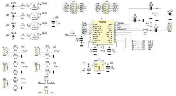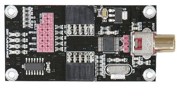 Moduł jest konfigurowalny i realizuje funkcje odbiornika lub nadajnika. Bazuje na popularnym układzie WM8804. Zwory konfiguracyjne umożliwiają wprowadzenie WM8804 w tryb pracy samodzielnej lub konfigurowanej przez I2C, określają standard transmisji szeregowej oraz konfigurują tryb odbiornik-nadajnik SPDIF. Diody LED sygnalizują aktualny status WM8804. Po konfiguracji modułu SPDIF w funkcji odbiornika podłączamy go z lewej strony DSP (gniazda we/wy na górnej krawędzi) do złącza I2SI płytki DSP. W tym przypadku pełni także funkcję generatora sygnału zegara MCLK, pracując jako urządzenie master.
