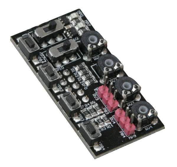 Drugim elementem zestawu jest płytka interfejsu użytkownika – DSP ADAU1701A_GPIO, której wygląd prezentuje fotografia 7. Procesor ADAU1701, posiada programowalne, wielofunkcyjne wyprowadzenia we/wy GPIO umożliwiające sterowanie pracą programu za pomocą zewnętrznych sygnałów analogowych i cyfrowych oraz podstawowe dwustanowe sterowanie układów współpracujących. Pozwala to na rezygnację z zastosowania zewnętrznego procesora sterującego nawet w złożonych aplikacjach.