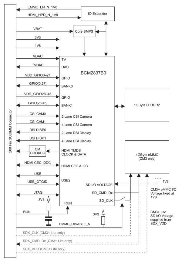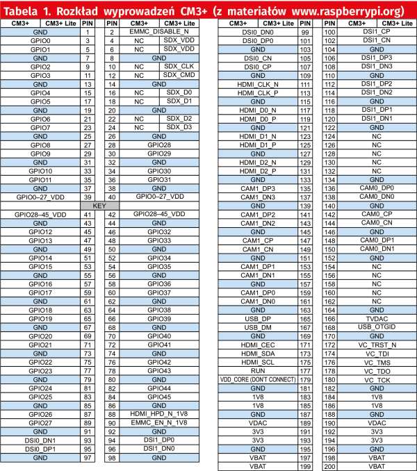 Dzięki zastosowaniu złącza SODIMM w porównaniu do wersji A/B Raspberry zwiększona mogła zostać liczba wyprowadzeń GPIO (do 48) i dostępnych (niektóre współdzielone z GPIO) dedykowanych interfejsów. CM3+ posiada interfejsy 2×I2C, 2×SPI, 2×UART, 2×SD/SDIO, HDMI 1.3, DPI RGB, 2×CSI (interfejs kamery 1×4 linie 1 GB + 1×2 linie 1 GB), 2×DSI (interfejs szeregowy wyświetlacza 1×4 linie 1 GB + 1×2 linie 1 GB), pamięci NAND SMI. Interfejsy są dostępne w kilku alternatywnych konfiguracjach GPIO (ALT0-5). Umożliwia to wykorzystanie ich w bardziej elastyczny sposób niż w PI A/B. Przykładowo w konfiguracji ALT2 możliwe jest jednoczesne podłączenie taniego wyświetlacza DPI RGB i interfejsu I2S, co z pewnością ucieszy konstruktorów rozwiązań multimedialnych. Pełna lista sygnałów dostępnych na złączu SODIMM pokazana jest w tabeli 1.