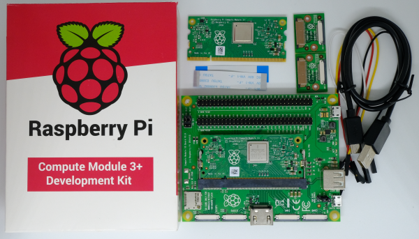Na rynku dostępne są oficjalne płytki Compute Module I/O dla każdego typu CM, na całe szczęście kolejne wersje płytek mają niższe ceny w porównaniu z pierwszym zestawem przeznaczonym dla CM1. Jednak rozpoczynając pracę z modułami CM3 najlepiej poszukać zestawu Compute Module 3+ Development Kit. Zestaw nie jest tani, bo kosztuje ok. 500 PLN (dla przypomnienia zestaw dla CM1 był wydatkiem powyżej 1000 PLN), ale w zamian otrzymujemy wszystko, co przydatne do szybkiego uruchomienia i przetestowania CM3+. Wygląd zestawu został pokazany na fotografii 1.