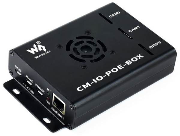 Płytka, podobnie jak poprzednia, posiada gniazdo HDMI, DSI i po dwa złącza kamer CSI. Tym razem interfejs GPIO jest ograniczony tylko do złącza zgodnego z HAT. Płytka posiada wbudowany obwód sterujący wentylatorem. Cena płytki wynosi 38 $, dostępna jest także w pakiecie z dedykowaną obudową (45 $), która po uzupełnieniu o CM3+ stanowi gotowe kompaktowe rozwiązanie. Moduł PoE w dedykowanej obudowie pokazano na fotografii 5.