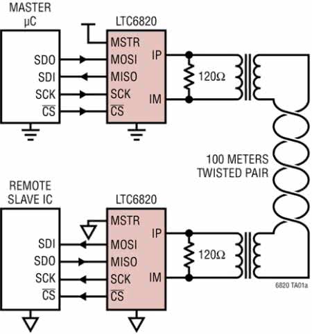 Typowe połączenie z użyciem układów LTC6820 zostało pokazane na rysunku 1. Pierwszy układ jest sterowany z mikrokontrolera lub innego sterownika nadrzędnego interfejsu SPI.