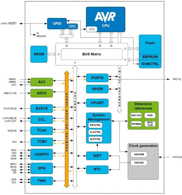 Mikrokontroler ATtiny402 został wyposażony w 4 kB pamięci programu, 128 bajtów pamięci RAM i 128 bajtów pamięci EEPROM i sprzętowy układ mnożący przyspieszający działania matematyczne. Podstawowy zestaw układów peryferyjnych zawierający timery, w tym RTC, interfejsy szeregowe i przetwornik ADC oraz konfigurowalny blok logiczny CCL, charakteryzuje się dużym stopniem niezależności – peryferia działają niemal samodzielnie.