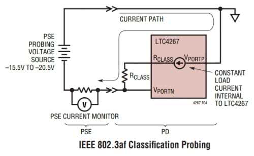 LTC4267 zawiera zintegrowany blok ustalania prądu klasyfikacyjnego. Specyfikacja IEEE 802.3af definiuje pięć klas o różnych poziomach poboru mocy. Projektant wybiera odpowiednią klasyfikację na podstawie zapotrzebowania aplikacji. Do każdej klasy przypisany jest prąd obciążenia, który musi oddziaływać na linię podczas sondowania klasyfikującego (rysunek 1). Urządzenie dostarczające zasilanie mierzy ten prąd w celu ustalenia właściwej klasyfikacji i dobrania parametrów dotyczące zasilania.