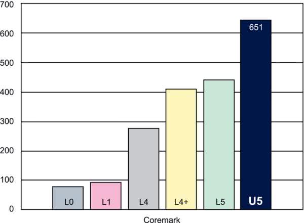 Dobrym sposobem porównania mocy obliczeniowej różnych mikrokontrolerów jest test wydajności CoreMark. Na rysunku 1 pokazano zestawienie wyniku uzyskanego przez układy STM32U5 na tle wyników innych mikrokontrolerów Ultra-Low Power STM32. STM32U5 osiągnął 651 punktów Coremark, znacząco więcej niż najbliższe mu STM32L4+ i STM32L5.