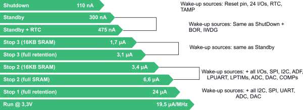 Zaprezentowane wartości odnoszą się do trybu aktywnego tzn. trybu o nazwie RUN. W trybie tym wszystkie elementy mikrokontrolera mogą pracować: rdzeń, zegary, pamięć i peryferia. Taka konfiguracja jest pożądana w momencie gdy kod jest wykonywany, co w aplikacjach Ultra-Low Power jest niezbędne tylko w krótkich momentach czasu. Przez większość czasu mikrokontroler przebywa w trybie low-power, w którym oczekuje na przerwanie, które go wybudzi. W mikrokontrolerach STM32U5 przewidziano szereg trybów low-power. Pierwszy z nich to Sleep, w którym tylko rdzeń jest uśpiony, a pamięć, zegary i peryferia ciągle mogą pracować. Kolejny tryb to STOP, w którym nieaktywny jest rdzeń, większość zegarów i część peryferiów. STOP ma cztery warianty: 0, 1, 2 i 3. Warto tu podkreślić, że tryb STOP3 jest innowacją, ponieważ żadne inne układy STM32 nim nie dysponują. Warianty trybu STOP różnią się od siebie liczbą peryferiów, które są zdolne wygenerować przerwanie i wybudzić mikrokontroler. Ostatnie tryby to Standby i Shutdown. W trybach tych większość zasobów mikrokontrolera jest wyłączona. Istnieje tylko kilka źródeł mogących wybudzić układ, a dodatkowo po wybudzeniu wykonywany jest reset, co wiąże się z koniecznością ponownej inicjalizacji peryferiów. Duży zestaw trybów low-power daje projektantom elastyczność i możliwość doboru odpowiedniego trybu dla każdej aplikacji. Zestawienie trybów pracy mikrokontrolerów STM32U5 wraz z listą peryferiów zdolnych do wybudzenia układu przez wygenerowanie przerwania pokazano na rysunku 2.