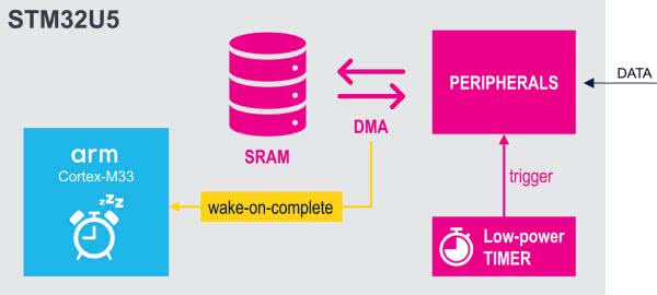 Niezwykle innowacyjnym elementem mikrokontrolerów STM32U5 w dziedzinie energooszczędności jest funkcjonalność o nazwie LPBAM (Low Power Background Autonomous Mode). Polega ona na wykorzystaniu funkcji DMA do transferu danych pomiędzy peryferiami a pamięcią SRAM w warunkach, kiedy rdzeń nie pracuje. Jest to mechanizm znany już z innych serii STM32, przy czym dotychczas jedynym trybem low-power wspierającym taką funkcjonalność był tryb Sleep, natomiast w STM32U5 możliwe jest użycie również trybów STOP, co radykalnie obniża zużycie prądu. LPBAM jest możliwy do zrealizowania dzięki przeprojektowanemu modułowi DMA.