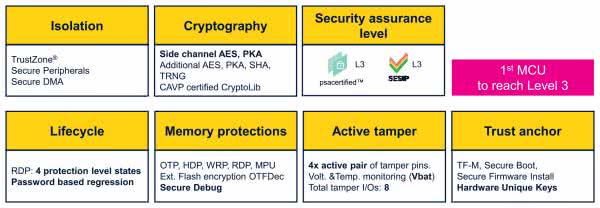 Na bazie zintegrowanych funkcji bezpieczeństwa producent uzyskał dla układów STM32U5 certyfikację PSA oraz SESIP, w obu przypadkach poziom 3. Dodatkowo w teście SecureMark-TLS mikrokontrolery te osiągnęły wynik na poziomie 133000 punktów.