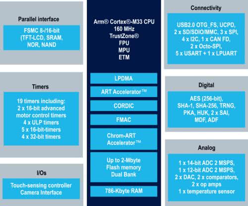 Istotnym blokiem zasobów mikrokontrolera są peryferia komunikacyjne. Podstawę stanowią tu standardowe interfejsy: SPI, I2C, U(S)ART oraz dedykowany do pracy razem z trybami low-power LPUART. Dodatkowo do dyspozycji są bardziej zaawansowane interfejsy: USB 2.0 OTG, USB Power Delivery, interfejs do kart pamięci, interfejs CAN w nowej specyfikacji FD i wspomniany już wcześniej przy okazji opisu zasobów pamięci interfejs Octo-SPI.