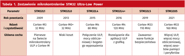Warto w tym miejscu krótko scharakteryzować każdą z wymienionych serii. STM32L1 to układy, które w momencie powstania były pierwszymi na rynku mikrokontrolerami Ultra-Low Power wykorzystującymi architekturę Cortex-M. STM32L0 to układy dysponujące prostym rdzeniem oraz stosunkowo małymi zasobami pamięci i peryferiów, co czyni je bardzo atrakcyjnym rozwiązaniem Ultra-Low Power pod kątem ceny. STM32L4 to niezwykle wszechstronne układy, których mocną stroną jest umiejętne połączenie energooszczędności, dobrej wydajności obliczeniowej oraz bogatych zasobów. Ich rozszerzeniem jest seria STM32L4+, która dysponuje większą mocą obliczeniową, dodatkową pamięcią oraz funkcjami graficznymi. Finalnie STM32L5 to mikrokontrolery, które akcentują mocno funkcje bezpieczeństwa. Tak zdefiniowane portfolio (zestawienie porównawcze pokazano w tabeli 1) pozwoliło firmie STMicroelectonics najpierw zaistnieć jako producent mikrokontrolerów Ultra-Low Power, a potem sukcesywnie budować swoją pozycję. Obecnie STM32 to jeden z rynkowych liderów w kategorii mikrokontrolerów Ultra-Low Power, za czym przemawiają liczby: łącznie 2 miliardy sprzedanych układów STM32L na przestrzeni lat 2009...2020. W lokalnych realiach przełożyło się to na wybitny wynik w postaci blisko 3 milionów sztuk dostarczonych do polskich klientów tylko w 2020 roku.