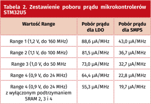 W mikrokontrolerach STM32U5 wprowadzono innowacyjny mechanizm polegający na możliwości wskazania jaka część pamięci SRAM jest podtrzymana. Częściowe wyłączenie podtrzymania pamięci SRAM skutkuje obniżeniem poboru prądu mikrokontrolera. W tabeli 2 pokazano zestawienie poboru prądu dla wszystkich opisanych wariantów konfiguracji bloku zasilania (tzn. z LDO, z SMPS, Range1/2/3/4, z częściowym podtrzymaniem pamięci SRAM). Warto w tym miejscu zaznaczyć, że wartości uzyskane przez układy STM32U5 są znacząco niższe niż w przypadku innych mikrokontrolerów STM32 Ultra-Low Power.