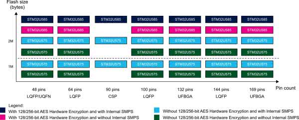 Oferta mikrokontrolerów STM32U5 jest bardzo zróżnicowana. Rodzina ta oferuje łącznie kilkadziesiąt typów układów, które różnią się od siebie kilkoma parametrami. Zacznijmy od pojemności zintegrowanej pamięci Flash. W tym zakresie do wyboru pozostają dwie opcje: 2 MB Flash i 1 MB Flash. Drugi parametr to blok sprzętowego szyfrowania: w zależności od preferencji konstruktora może być on dostępny w mikrokontrolerze lub nie. Trzeci element rozróżniający układy to blok zasilania. Może on bazować albo tylko na wbudowanym regulatorze napięcia LDO, albo może on wykorzystywać zarówno regulator napięcia LDO jak też przetwornicę SMPS. Warto zwrócić uwagę, że parametr ten wpływa na funkcje pinów, co przekłada się na brak kompatybilności układu wyprowadzeń wersji mikrokontrolera z LDO w porównaniu do mikrokontrolera z LDO i SMPS. Do wyboru jest też szeroki wachlarz typów obudowy (LQFP, UQFN, CSP, UFBGA) i liczby pinów (od 48 do 169). Pełną ofertę rodziny mikrokontrolerów STM32U5 pokazano na rysunku 6.