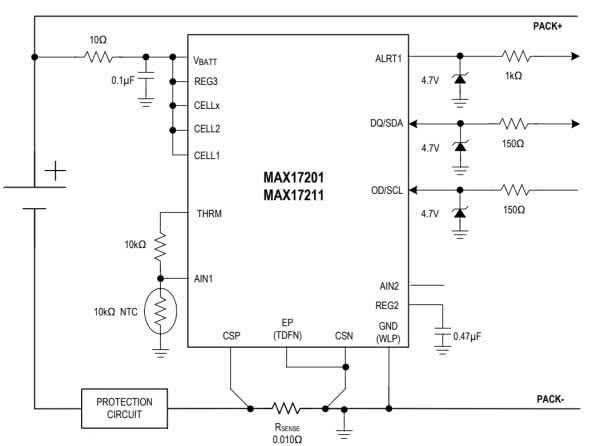 Schemat podstawowej aplikacji układu został pokazany na rysunku 2. Może kontrolować jedno ogniwo lub pakiety 2S lub 3S. Aby zapobiec klonowaniu baterii, układy scalone integrują uwierzytelnianie SHA256 ze 160-bitowym tajnym kluczem oraz każdy IC zawiera unikalny 64-bitowy identyfikator.
