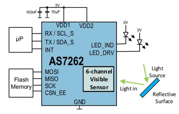 Czujnik wymaga dołączenia pamięci SPI Flash, zawierającej oprogramowanie firmware (rysunek 2), która jest już u mieszczona na płytce modułu. Komunikacja odbywa się poprzez interfejs I2C, adres modułu to 0x49. Wymaga zasilania w zakresie 3...6 V i ma wymiary: 19×21×4 mm.