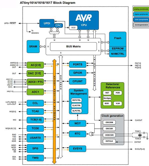 Cztery układy licznikowe typu Timer, interfejsy UART oraz I2C, przetworniki ADC i DAC i jeszcze 14-kanałowy kontroler klawiatury pojemnościowej, to tylko wybrane peryferia tego komponentu.