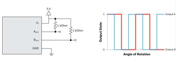 To pozwala na większą elastyczność projektowania i większe tolerancje montażowe. Czujnik został tak zoptymalizowany, że na sygnał wyjściowy nie ma wpływu „bicie” czy wibracje elementów mechanicznych lub nagłe zmiany szczeliny powietrznej. Jest niewrażliwy na wielkość bieguna magnesu i nie wymaga parowania czujnika z magnesem pierścieniowym. Działa w szerokim zakresie prędkości, temperatur i szczelin powietrznych. Typowa aplikacja układu i przebiegi wyjściowe zostały pokazane na rysunku 1.