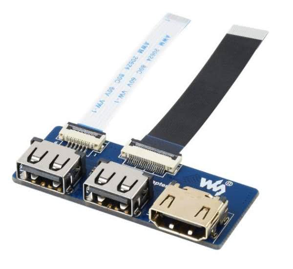 Jeżeli w naszej aplikacji chcemy skorzystać z dodatkowych interfejsów konieczny jest zakup płytki USB HDMI Adapter (fotografia 2) lub zestawu CM4-IO-BASE-Acce z dołączonym adapterem. Połączenie z płytką bazową realizowane jest za pomocą dostarczonych taśm elastycznych, a sygnały USB i HDMI wyprowadzone są na typowe złącza, co ułatwia korzystanie z nich.